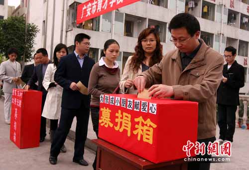 中新網(wǎng)成都4月26日電(廖小兵 王天青 曾一瑩)在“4.14”青海玉樹大地震中,四川廣安區(qū)龍安鄉(xiāng)文林村四組村民張朝清、聶文蘭夫婦雙雙遇難,留下遺孤張成與72歲的奶奶相依為命。消息傳來,愛心如潮,廣安區(qū)各界人士紛紛伸出援助之手。26日8時(shí)許,在廣安城南新區(qū)的育才學(xué)校校園內(nèi),師生們?yōu)榧娂娍犊饽,?dāng)場收到捐款15100.90元。