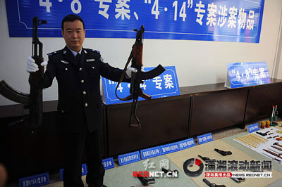B——4月14日,長(zhǎng)沙市公安局雨花分局金桃派出所巡防隊(duì)員查獲8支非法販運(yùn)的槍支,長(zhǎng)沙警方在浙江、上海、云南、廣東公安機(jī)關(guān)的協(xié)作下,破獲了一起從境外向“長(zhǎng)三角”地區(qū)販運(yùn)槍支的大案。此案繳獲包括殺傷力極大的M16、AK47突擊步槍在內(nèi)的各種軍用槍支13支、子彈305發(fā),抓獲犯罪嫌疑人7人。