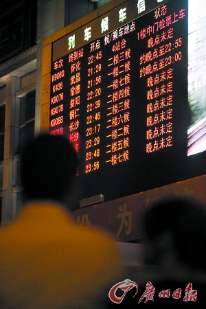 “已經(jīng)等了3個(gè)多小時(shí)了。我是請(qǐng)假陪女兒去旅游的,現(xiàn)在多掃興!编w女士在電話中對(duì)記者抱怨。鄔女士原本打算乘坐晚上8時(shí)05分的廣州至張家界列車。7時(shí)許,她和女兒趕至候車大廳,隨即被告知受災(zāi)情影響,列車晚點(diǎn)了。鐵路工作人員告訴乘客,可以全額退票,也可換第二日的票!爱(dāng)時(shí)很多人涌去了退票窗口,上千人擠在一起,很壯觀,跟春運(yùn)一樣。由于退票換票的人實(shí)在太多,與此同時(shí),廣場(chǎng)大屏幕開始滾動(dòng)顯示受到影響晚點(diǎn)的列車。晚上9時(shí)許,鄔女士決定退票,被鐵路工作人員告知,她們乘坐的列車可能今晚就會(huì)開出。“我是特意請(qǐng)假陪女兒去旅游的,今晚能開車那我肯定不愿意退票了!庇谑,鄔女士母女決定繼續(xù)等。但直至晚上10時(shí),她們還是沒(méi)能上車。此時(shí),由于陸續(xù)有列車開車,廣場(chǎng)上的人流少了一半。盡管郁悶,但鄔女士還是顯得很有耐性!安贿^(guò)有人開始發(fā)脾氣扔行李了!编w女士告訴記者。