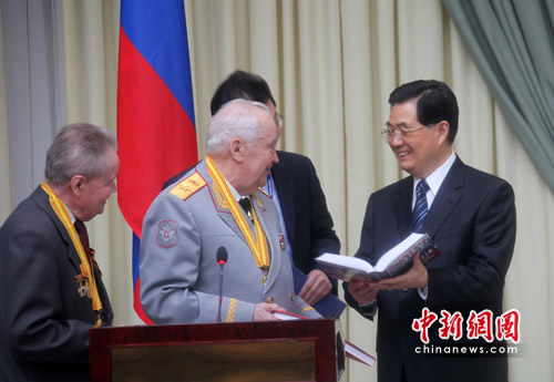 胡錦濤向俄羅斯老戰(zhàn)士們發(fā)表講話,并向他們頒發(fā)“和平”獎章和證書。