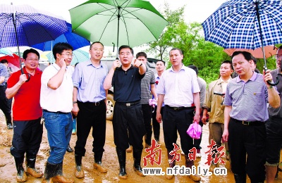 汪洋和省委常委、秘書長徐少華一到韶關(guān),就在韶關(guān)市委書記徐建華、市長鄭振濤等陪同下,趕到災(zāi)情最為嚴(yán)重的翁源縣翁城區(qū)富陂村。