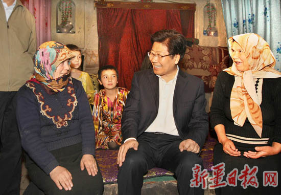 隨后,張春賢又走進已遷入抗震新房的熱合曼·麥提尼亞孜家,與他及妻子布拉比古麗盤腿坐在客廳的花氈上拉起了家常。