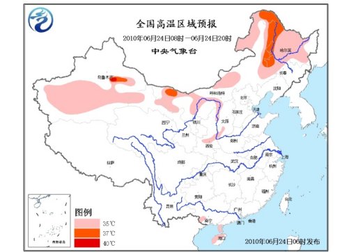 中新網(wǎng)6月24日電 中央氣象臺6月24日06時繼續(xù)發(fā)布高溫藍色預警:預計,今天白天,甘肅西部、寧夏北部、內(nèi)蒙古大部、黑龍江大部、吉林西部、山西西南部、陜西關中地區(qū)、廣東雷州半島、廣西西南部的局部地區(qū)、海南中北部等地有35~37℃的高溫天氣,其中,內(nèi)蒙古西部的局部地區(qū)最高氣溫可達40~41℃。