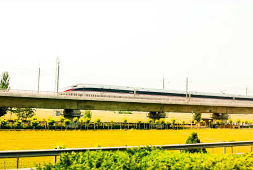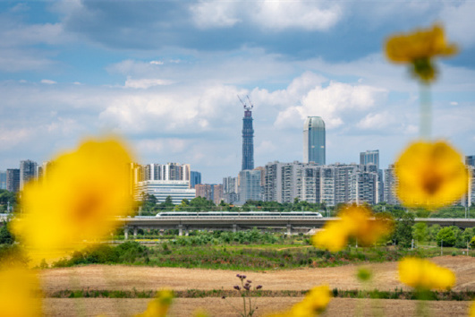 在城市的鋼鐵森林中,高鐵列車宛如一條靈動(dòng)的銀蛇。它穿梭在高樓大廈之間,與城市的繁華完美相融。(投稿:潘宇)