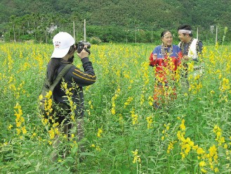 部分游客專程到秀林鄉(xiāng)記錄太陽麻花海景觀,身穿原住民賽德克族傳統(tǒng)服飾,置身在黃花綠葉的花海間,手持?jǐn)z影機(jī)拍攝東海岸綠肥作物。