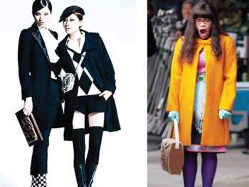 拋開丑女貝蒂的身材不說,這件橙色大衣搭配紫色絲襪還是挺不錯(cuò)的,對(duì)比色運(yùn)用得很到位,圓頭淑女鞋搭配得也無懈可擊。