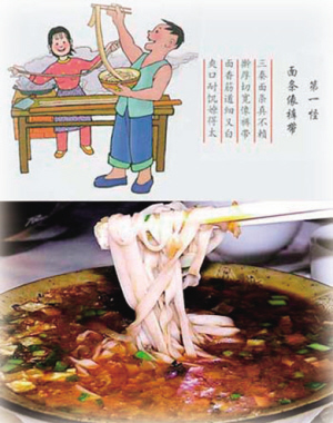 中國人吃面講究很多,實(shí)質(zhì)是把“人之常情”,“世間常理”物化在面條中。過生日吃長壽面;娶媳婦、喬遷新居要吃打鹵面,有湯有面有滋有味;農(nóng)歷二月二“龍?zhí)ь^”祈盼風(fēng)調(diào)雨順吃龍須面。不同時(shí)節(jié),不同的喜慶節(jié)日吃不同的面條。