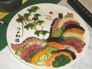 以色命名:金玉羹、玉露團、琥珀肉。以時令命名:冬凌粥、秋葉餅。以烹調(diào)技法命名:滑熘里脊、粉蒸肉、干炸帶魚。以地名命名:北京烤鴨、南京板鴨、涪陵榨菜。以人物命名:東坡肉、文思豆腐、宮爆雞丁。以典故命名:柳浪聞鶯、掌上明珠、陽關(guān)三疊。以比喻、寄意、抒懷命名:通神餅、龍鳳腿、龍眼包子、麒麟魚、鴛鴦魚片、螞蟻上樹。以數(shù)字命名:一窩絲、二色膾、三不粘、四美羹、五福餅、六一菜、七返糕、八寶飯、九絲湯、十遠羹、酒醉十三蠔、二十四氣餛飩、五彩牛百葉、八寶三味梨、百鳥歸鳳、千層糕、萬年紫鮑。