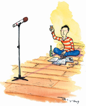 當(dāng)天我起了個(gè)大早,一到現(xiàn)場(chǎng),滿是俊男、美女在引吭練唱。電視上的歌唱比賽,常有人音準(zhǔn)不好、歌詞忘詞。評(píng)審老師都說(shuō)要大家別緊張,明明參賽者都知這個(gè)道理,就是難以克服心理障礙。以前也看過(guò)書上寫,就當(dāng)臺(tái)下的不是人,是豆子!但談何容易,放眼望去,上百雙眼睛目光如炬,猛盯著我看。