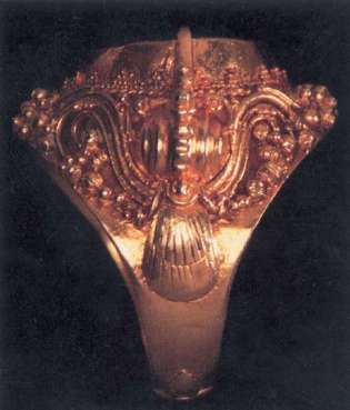 例如附圖的印度黃金指環(huán),工藝甚精美,浮雕圖案富有民族風(fēng)格,獨(dú)特典麗,就是十九世紀(jì)初期的代表作。其實(shí),我國(guó)晉代時(shí)也有鏨刻典麗花紋的金指環(huán),當(dāng)然風(fēng)格大相徑庭,但更如鳳毛麟角。