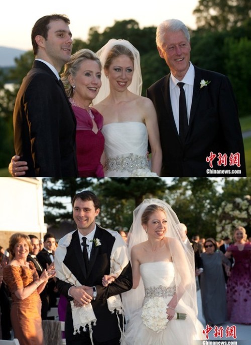 新郎麥文斯基與前總統(tǒng)克林頓則穿上英國(guó)品牌BURBERRY,希拉里選穿美國(guó)設(shè)計(jì)師品牌奧斯卡德拉倫塔量身打造的莓紅色禮服。