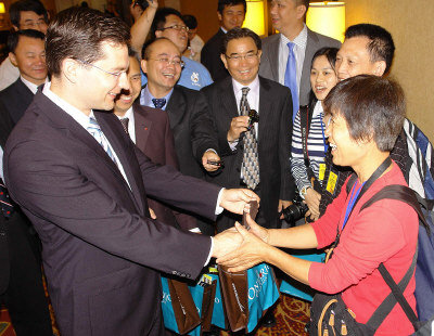 在與杜江等人會晤后,柏利文也代表哈珀總理,向首發(fā)團廣東中旅團員致贈紀(jì)念品,并一一握手問好、寒暄與交談。