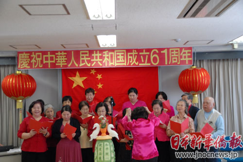 東京各界華僑和應邀前來參加活動的日中友好會館、在日朝鮮人總聯(lián)合會、在日大韓民國民團、日本新華僑華人會、在日中國企業(yè)協(xié)會、日本中華總商會、橫浜華僑總會、長野華僑總會等團體在中華人民共和國61年國慶前夕齊聚一堂,華人華僑的愛國思鄉(xiāng)之情涌上心頭。席間,東京華僑婦女會會長吳少煖帶領婦女會員們?yōu)榇髸I唱一曲《五星紅旗》,不僅抒發(fā)了大家思念之情,更激發(fā)了眾人的愛國激情。吳少煖包含激情地表示:“我們獨在異鄉(xiāng)為異客,每逢佳節(jié)倍思親。雖然身在異鄉(xiāng),但是思念祖國的心是一直沒有改變過的。望祖國今后更加繁榮富強!