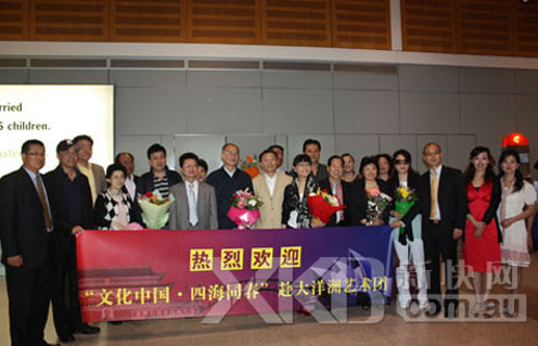 趙陽(yáng)一行抵達(dá)悉尼后,受到胡山總領(lǐng)事等的熱情歡迎,悉尼藝術(shù)界、僑界代表拉起橫幅,送上鮮花,熱情歡迎到悉尼作慰問演出的藝術(shù)團(tuán)一行。