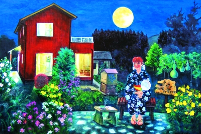 黑藍(lán)色的夜空,掛著冰鏡碧玉般的月亮,柔柔的月光下,一個(gè)穿著藍(lán)底白花夏日和服(浴衣)的日本女性,坐在院子里長(zhǎng)滿鮮花綠草的木桌旁,桌子上放著一封開(kāi)啟的信件,她的眼神是寂寞、憂傷,是祈念、期待。她在等待誰(shuí)?又在祝福誰(shuí)?畫的題目是“但愿人長(zhǎng)久”。