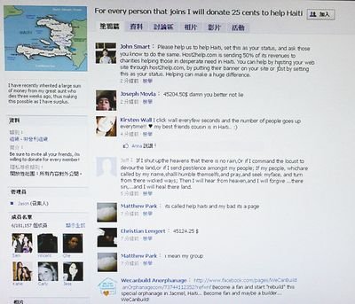 事實上,王Jason并不是唯一發(fā)起該行動的人或組織,在Facebook網(wǎng)站,在搜索欄輸入英文Haiti,就會顯示2800個相關(guān)搜索結(jié)果,有的群組主旨和王Jason發(fā)起的類似,比如“該群組每加入一個人我就捐0.05美分幫助海地”、“該群組每加入一個人我就捐10美元幫助海地”,區(qū)別只是捐助金額的不同,但目前加入王Jason創(chuàng)立的群組人數(shù)最多。