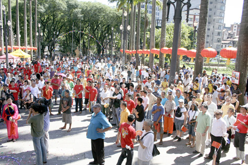 6日上午,圣保羅市中心SE 廣場四周懸掛數(shù)十個(gè)巨型大紅燈籠,古老的大教堂前臨時(shí)搭起了舞臺,臺上貼有中國春聯(lián)掛有中國結(jié)等節(jié)日吉祥物,組合音響播放著喜慶的中國民樂,廣場一側(cè)設(shè)有中國文化藝術(shù)攤位,廣場上一派節(jié)日的歡快喜慶景象。