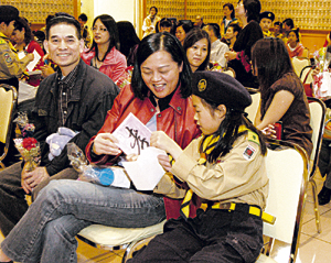與丈夫史文山在教國際標(biāo)準(zhǔn)舞的沈柏容,在看到9歲的女兒史洛謙,送了張印有一個大大“孝”字的卡片和一大花束康乃馨時,笑得合不攏嘴。佛光童軍小兄妹譚明駿和譚明麗,也各送了張“孝”卡給媽媽王淑芬。王淑芬說,能在佛光山收到子女的愛心卡和康乃馨,很有意義。
