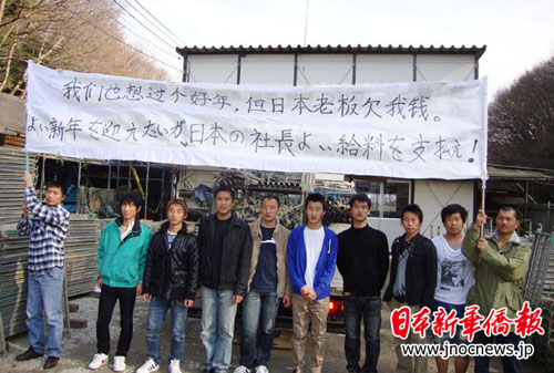 中新網(wǎng)12月31日電 據(jù)日本新華僑報(bào)網(wǎng)報(bào)道,“我們也想過個(gè)好年,但日本老板欠我的錢!”12月30日上午,十名來自東北的在日中國實(shí)習(xí)生在他們的住地前打出雙語橫幅,憤怒譴責(zé)他們所在的“健陽”株式會(huì)社的日本老板拖欠工資的行為。
