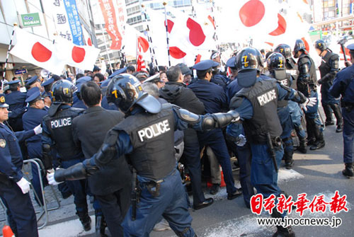 當他們在警崗前叫嚷結束后,準備前往“陽光城”物產店前騷擾搗亂。這個時候,警方機動隊一擁而上,將他們團團圍住,并且在四周設立了鐵欄障礙。他們發(fā)瘋般狂喊口號,做著“突圍”的動作。警方機動隊絲毫不為所動。一輛寫著“以恢復主權為目標之會”的面包車開了過來,跳下一個小頭目高喊:“我們去池袋警察署抗議!我們申請后拿到了許可,為什么不允許我們去?”然后,他們分散陸續(xù)前往池袋警察署。