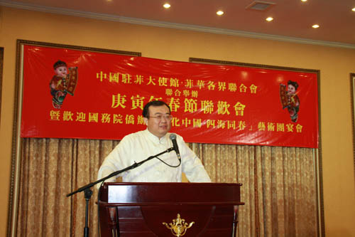 當(dāng)天晚上,中國駐菲律賓大使館和菲華各界聯(lián)合會舉辦盛大的聯(lián)歡晚宴,歡迎藝術(shù)團的到來。菲華各界聯(lián)合會主席戴宏達(dá)、中國駐菲律賓大使劉建超、藝術(shù)團團長熊昌良分別發(fā)表熱情洋溢的致辭。在致辭中,戴宏達(dá)主席和劉建超大使對國務(wù)院僑辦組派如此高水準(zhǔn)的藝術(shù)團來菲演出表示感謝,各位藝術(shù)家放棄在春節(jié)與家人團聚的機會,千里迢迢赴海外慰問僑胞,用歡快的歌聲和舞蹈為海外僑社增添了喜慶的春節(jié)氣氛。全體旅菲僑胞將翹首期盼藝術(shù)團的演出取得圓滿成功。