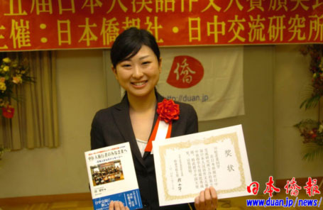 日本麗澤大學(xué)中文系三年級(jí)學(xué)生川松若菜的作文抓住“赴日中國(guó)游客激增”這一現(xiàn)實(shí),以“致訪問日本的中國(guó)旅行者”為題,給中國(guó)游客提出了溫馨的提示和建議,獲得中國(guó)駐日使館程永華大使簽署的“中國(guó)大使獎(jiǎng)”。