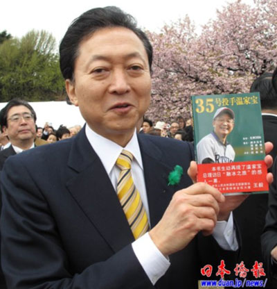 在“賞櫻會”上,受邀參加的日本僑報社張景子社長向鳩山首相贈送了該社出版的《35號投手溫家寶》,鳩山首相欣然收下,并勉勵日本僑報社繼續(xù)為日中交流做貢獻。張景子說,“我們來自中國,在日本創(chuàng)辦的日本僑報出版社致力于日中交流,已經(jīng)出版了200來本書。2008年出版了中日文版《35號投手溫家寶》,今天特地給您帶來了一本!兵F山首相高興地從張景子手中接過《35號投手溫家寶》一書,仔細端詳,并說:“我下個月就要與溫家寶總理會面。希望你們繼續(xù)努力,為促進日中交流作出更大的貢獻!闭f完,鳩山首相高高地舉起《35號投手溫家寶》一書,讓大家拍照。