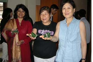 當把專門從國內(nèi)帶來的蘆葦葉準備好后,印度朋友們都紛紛圍到廚師身旁,饒有興致地學習包粽子,仔細地詢問如何鋪葉、卷葉、捆扎等細節(jié),并動手制作。粽子煮熟后,印度朋友們高興地品嘗了她們稱之為“中國布丁”的美食,并稱贊粽子味道很美。