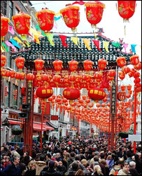 近年倫敦新年慶;顒游娜A人華僑、英國本地人乃至世界各國的游客超過20萬人。為迎接牛年,倫敦的唐人街區(qū)已掛滿了大紅燈籠,過年氣氛濃厚。倫敦華埠商會會長吳國強介紹說,今年的慶春活動從大年初一在唐人街的舞獅表演拉開帷幕;年初六在唐人街六角亭和石獅子旁開設(shè)春節(jié)攤位。