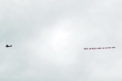 此外,在此前13日達(dá)賴?yán)锍鱿奈餮艌D萬人集會(huì)上,有華人租用飛機(jī),拉出“達(dá)賴停止支持暴亂”(Dalai: stop supporting Riots)的標(biāo)語,在空中繞場不斷飛行,讓達(dá)賴抬頭看到。