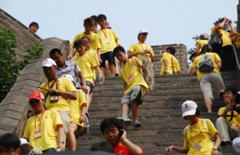 中新網(wǎng)7月28日電 據(jù)廣東僑網(wǎng)消息,在人民大會堂參加完隆重的開營儀式后,廣東省僑辦組織的550多名華裔青少年乘坐12部大巴,于7月25日下午浩浩蕩蕩的前往京城之旅的第一站——京北長城沿線最著名的古關城居庸關,勇于攀登的廣東團營員成為“中國尋根之旅”團隊中的首批“好漢”,很多第一次到中國的華裔青少年實現(xiàn)了成為“長城好漢”的夢想。