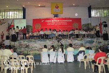 比賽正式開始了。半決賽采用的是分組答題的形式,13支代表隊通過回答30道題,決出了總分前5名參加決賽。決賽有兩道必答題,20道搶答題。題目內容涵蓋了中國古代四大發(fā)明、四大名著、中國地理、中菲關系等歷史和時事題,同學們對中國知識的了解超乎想象,他們知道中國發(fā)明的地動儀,知道孔子說過“三人行必有我?guī)煛,文天祥的“人生自古誰無死,留取丹心照汗青”,以至于中國的國徽圖案,新中國建國典禮等等。參賽的同學在臺上聚精會神地答題,每答對一題,臺下就爆發(fā)出雷鳴般的掌聲和歡呼聲。到?jīng)Q賽的搶答題時,場上的氣氛達到了最高點,同學們都站了起來,為他們的隊伍搖旗吶喊。經(jīng)過激烈的角逐,最后帕西格市立科技中學獲得了第一名。