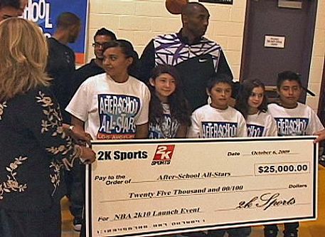 在洛杉磯的一個(gè)叫做《大家都是大明星課后輔導(dǎo)項(xiàng)目》的捐款儀式上,科比主持籃球電子游戲比賽,讓他的湖人隊(duì)同伴以及快艇隊(duì)的兩個(gè)球員戈登和卡曼大戰(zhàn)中學(xué)生,在游戲?qū)购,布萊恩特把一張兩萬(wàn)五千美元的支票,捐給了洛杉磯輔導(dǎo)項(xiàng)目的執(zhí)行長(zhǎng)坎波斯。