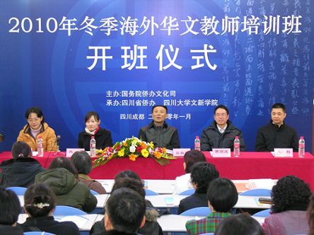 中新網(wǎng)1月6日電 據(jù)四川僑網(wǎng)消息,1月6日,由國務(wù)院僑辦文化司主辦,四川省僑辦和四川大學(xué)承辦的2010年冬季海外華文教師培訓(xùn)班在四川大學(xué)開班。這是四川省僑務(wù)系統(tǒng)首次承辦海外華文教師培訓(xùn)班。四川省僑辦副主任吳振西、四川大學(xué)文學(xué)與新聞學(xué)院院長曹順慶出席開班儀式并致辭。四川大學(xué)文學(xué)與新聞學(xué)院黨委書記熊蘭主持儀式。