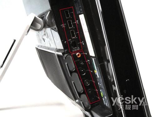 主機背部的“內(nèi)容”要比正面豐富的多,帶阻尼效果的支架占據(jù)了機身背部的大部分的空間,根據(jù)實際測試,該支架可以張開50度,滿足不同角度觀看主屏的需求。