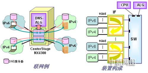 可以在ALG 刀片上搭載將DNS咨詢進(jìn)行IPv6-IPv4轉(zhuǎn)換的ALG功能。與轉(zhuǎn)換服務(wù)器刀片協(xié)作可以實現(xiàn)IPv6與IPv4的雙方向通信。