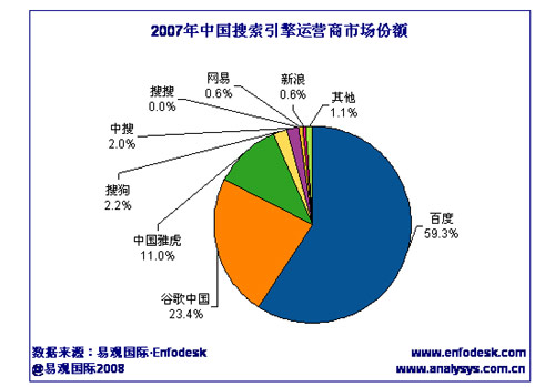 調查咨詢公司易觀國際昨天在網上公布的《中國搜索引擎市場年度綜合報告》顯示,2008年,百度與谷歌中國仍然占據中國搜索引擎運營商第一陣營,市場集中度進一步提高。
