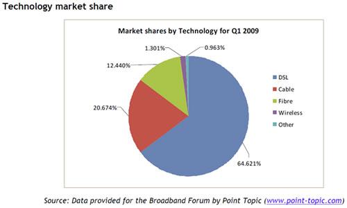 按技術(shù)劃分,DSL仍是主流寬帶技術(shù),市場份額為64%。其次為線纜(有線電視)接入,市場份額為20%。光纖排名第三,市場份額為12%。