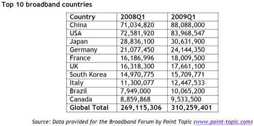 報告顯示,今年第一季度全球新增1660萬條寬帶線路,使總線路達到4.292億條。其中,中國寬帶線路為8808萬條,排名首位。美國為8396萬條,位居第二。日本為3063萬條,排名第三。第四至第十位排名依次為德國、法國、英國、韓國、意大利、巴西和加拿大。
