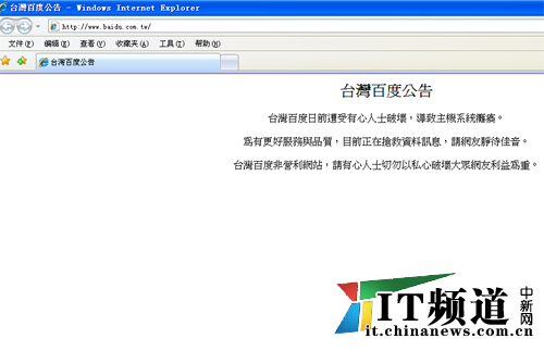臺灣百度發(fā)布的公告稱:“臺灣百度日前遭受有心人士破壞,導致主機系統(tǒng)癱瘓。為有更好服務與質(zhì)量,目前正在搶救數(shù)據(jù)訊息,請網(wǎng)友靜待佳音。臺灣百度非營利網(wǎng)站,請有心人士切勿以私心破壞大眾網(wǎng)友利益為重!