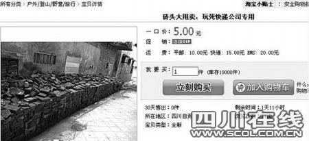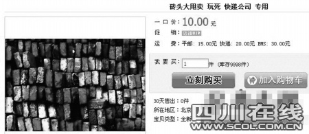 近日,店主“千尋kission”在淘寶網(wǎng)上發(fā)布了“磚頭大甩賣,玩死快遞公司專用”的銷售標(biāo)題,表示將以5元一斤的價(jià)格販賣磚頭。其中的產(chǎn)品說明還頗有幾分《武林外傳》中呂秀才的風(fēng)采:“泄憤也可用磚頭,本磚頭專為對(duì)付那些服務(wù)態(tài)度不好的快遞送貨員設(shè)計(jì),如果你們對(duì)那些惹您生氣的快遞員投訴無門,無處泄憤請(qǐng)拍下此產(chǎn)品!