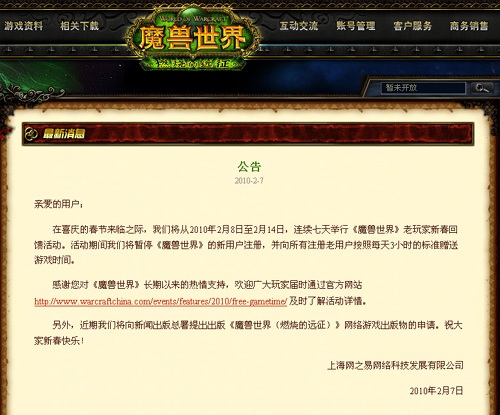 網(wǎng)易昨天是在一篇魔獸世界游戲內(nèi)活動(dòng)的公告中披露上述消息的。公告稱(chēng)將從2010年2月8日至2月14日,連續(xù)七天舉行《魔獸世界》老玩家新春回饋活動(dòng);顒(dòng)期間將暫!赌ЙF世界》的新用戶注冊(cè),并向所有注冊(cè)老用戶按照每天3小時(shí)的標(biāo)準(zhǔn)贈(zèng)送游戲時(shí)間。