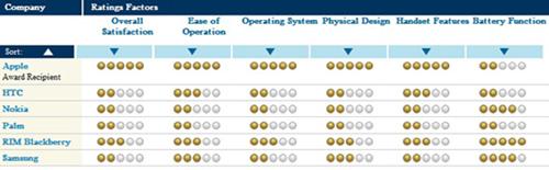 J.D. Power在手機(jī)的可操作性、操作系統(tǒng)、外觀設(shè)計(jì)、功能和電池功能5大方面進(jìn)行了調(diào)查,iPhone在前四項(xiàng)中均獲得滿分,只有在電池方面略遜于競爭對手。