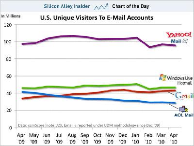 comScore數(shù)據(jù)顯示,今年4月,雅虎電子郵件用戶數(shù)量仍高居榜首,微軟Hotmail位居第二,但用戶數(shù)量僅為雅虎用戶數(shù)量的一半。