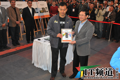 中新網(wǎng)10月30日電 下午6點(diǎn),中國(guó)聯(lián)通iPhone手機(jī)正式在中國(guó)市場(chǎng)發(fā)售。中國(guó)聯(lián)通副總經(jīng)理李剛現(xiàn)場(chǎng)售賣第一臺(tái)iPhone,同時(shí)中國(guó)聯(lián)通高層向現(xiàn)場(chǎng)購(gòu)得手機(jī)的第一位機(jī)主頒發(fā)證書(shū)。
