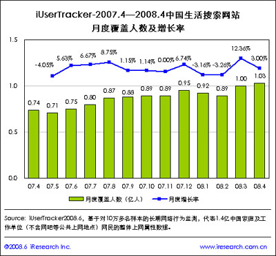 近日,艾瑞咨詢發(fā)布國(guó)內(nèi)首部《中國(guó)生活搜索行業(yè)市場(chǎng)研究報(bào)告》。報(bào)告顯示,截至2008年4月,國(guó)內(nèi)生活搜索覆蓋人群已經(jīng)超過(guò)1.03億,較去年同期增幅39%,超過(guò)網(wǎng)絡(luò)游戲用戶數(shù)量5700萬(wàn),已經(jīng)成為中國(guó)網(wǎng)民上網(wǎng)的主流應(yīng)用。