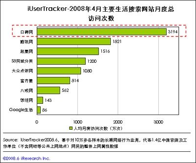 報(bào)告指出,經(jīng)過(guò)幾年的發(fā)展,國(guó)內(nèi)生活搜索發(fā)展的格局日趨明朗,口碑網(wǎng)、酷訊、趕集網(wǎng)等網(wǎng)站逐漸脫穎而出。其中,借助阿里巴巴集團(tuán)強(qiáng)勁的資源優(yōu)勢(shì),2004年成立的口碑網(wǎng)已發(fā)展成國(guó)內(nèi)最大的生活搜索網(wǎng)站。其用戶月度總訪問(wèn)次數(shù)3194萬(wàn)次,幾為第2位的酷訊網(wǎng)1821萬(wàn)次和第3位趕集網(wǎng)1516萬(wàn)次的總和。在人均月度訪問(wèn)次數(shù)上,口碑網(wǎng)也以1.85次居榜首。