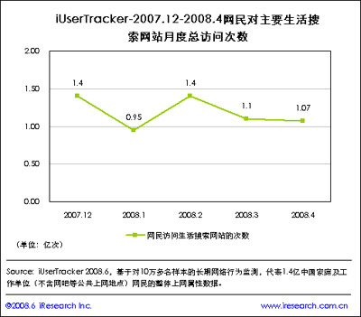 調(diào)查顯示,2007年12月用戶對(duì)生活搜索網(wǎng)站的月度總訪問(wèn)次數(shù)為1.04億次,2008年1月份顯著下降,為0.66億次,艾瑞考察整體網(wǎng)民總體的訪問(wèn)次數(shù)發(fā)現(xiàn),出現(xiàn)這一現(xiàn)象的原因在于網(wǎng)民的總體訪問(wèn)次數(shù)整體呈下降趨勢(shì),主要受元旦和春節(jié)等節(jié)假日影響;此后網(wǎng)站訪問(wèn)總次數(shù)呈穩(wěn)步上升趨勢(shì)。