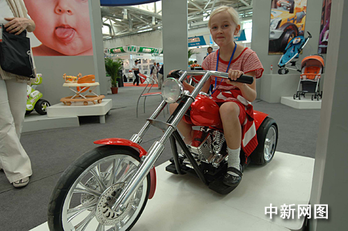 展覽會(huì)上,一個(gè)外國(guó)孩子騎著中國(guó)發(fā)明制造的玩具電動(dòng)車(chē)。(鄒憲 攝)