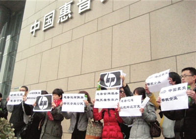 當(dāng)天上午10點(diǎn)半左右,在國(guó)貿(mào)橋東南角的中國(guó)惠普大廈門前,十余名消費(fèi)者手舉自制的紙牌抗議,引來路人圍觀。紙牌上寫著“蟑螂無(wú)罪惠普可恥”、“HP,中國(guó)最受鄙視企業(yè)”、“惠普之道,以狡辯應(yīng)萬(wàn)變”等口號(hào)。抗議進(jìn)行了10分鐘左右,消費(fèi)者來到中國(guó)惠普大廈的8層,看到“惠普解決方案體驗(yàn)中心”的招牌后,消費(fèi)者又舉起紙牌進(jìn)行抗議,并要求與售后總監(jiān)談判。11點(diǎn)左右,惠普售后總監(jiān)陳女士來到現(xiàn)場(chǎng)。